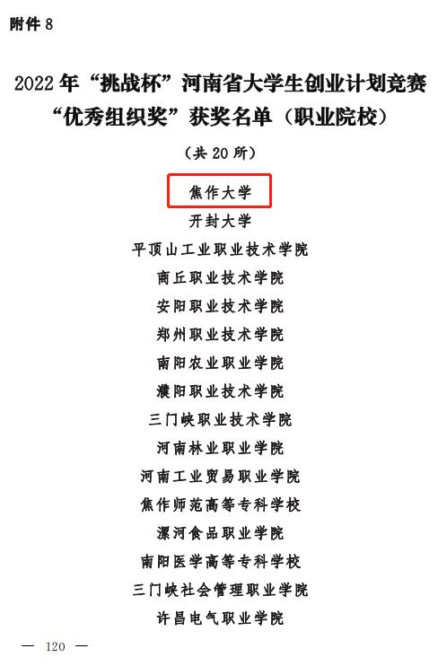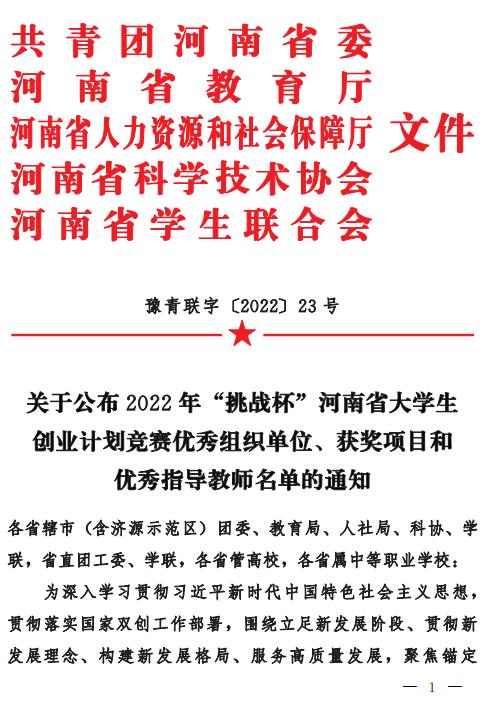 近日,由共青團河南省委、河南省教育廳、河南省人力資源和社會保障廳、河南省科學技術協會、河南省學生聯合會聯合下發(fā)了《關于公布2022年“挑戰(zhàn)杯”河南省大學生創(chuàng)業(yè)計劃競賽優(yōu)秀組織單位、獲獎項目和優(yōu)秀指導教師名單的通知》(豫青聯字〔2022〕23號)。焦作大學在比賽中表現優(yōu)異,獲得代表大賽集體成績的“優(yōu)秀組織獎”榮譽稱號。焦作大學學子作品在省賽中斬獲金獎3項、銅獎4項的歷史最好成績,栗巖、侯強等12位教師被授予“優(yōu)秀指導教師”稱號。