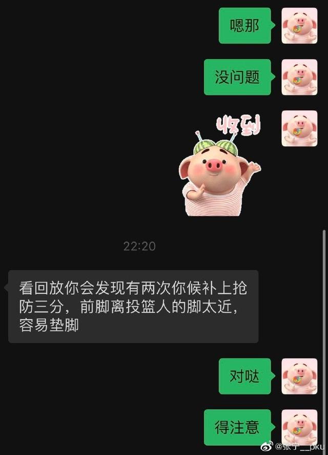 張寧社交媒體上經(jīng)常會發(fā)有關(guān)自己的故事——3月初的微博上,張寧發(fā)了自己和父親的聊天截圖。在一張自拍照開啟的聊天中,張爸回了一段消息:“看回放你會發(fā)現(xiàn)有兩次你候補上搶方三分,前腳里投籃人的腳太近,容易墊腳。”而張寧的回復(fù)則是:“對噠,得注意!”