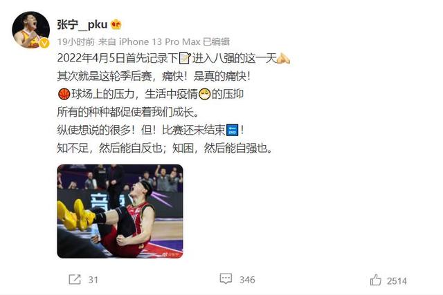 4月5日晚,山西男籃大比分2-1淘汰廣州男籃晉級八強后,張寧在社交媒體留下了這樣一段話。