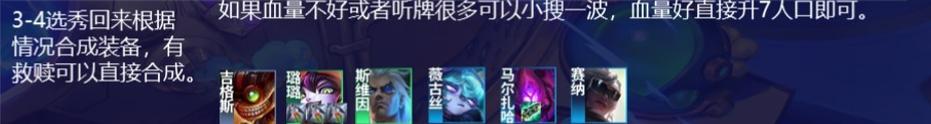 3階段選完秀,決定好方向,拿完裝備合適就可以直接合成,開始留體系牌,準(zhǔn)備4階段變陣,質(zhì)量高也可以直接變陣,刷相關(guān)??怂埂?/p>