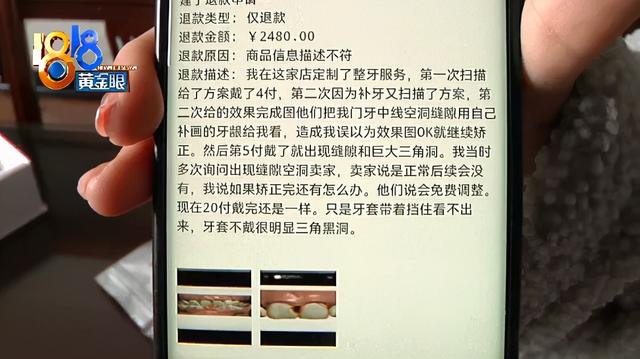 柴女士:在戴到第五副的時候,我就發(fā)現(xiàn)門牙中間出現(xiàn)巨大的黑洞和縫隙,我就詢問賣家,他說這是正常現(xiàn)象,然后后面這個縫隙越來越大,他還調(diào)侃我說,如果沒有出現(xiàn)牙縫怎么整,我認(rèn)為是他當(dāng)時給我的設(shè)計方案就有問題,他當(dāng)時的設(shè)計方案就是肯定會產(chǎn)生黑洞的,他沒有給我標(biāo)注,而是自己添加了牙齦,就是他美化了效果圖。