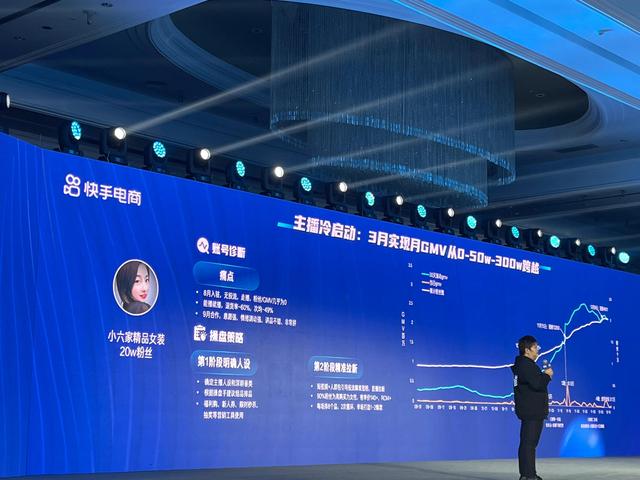 目前,“小六家精品女裝”主播已經(jīng)擁有24萬粉絲。在每天長達(dá)10小時的直播中,董家鵬及其團(tuán)隊全程跟蹤。在他們的運(yùn)營輔助下,現(xiàn)在賬號每天的直播峰值已經(jīng)超過3萬人、GMV超過300萬,所售賣的打底衫銷量高居快手品類第一。主播成功從實體服裝店店長,轉(zhuǎn)型為快手平臺直播帶貨達(dá)人。