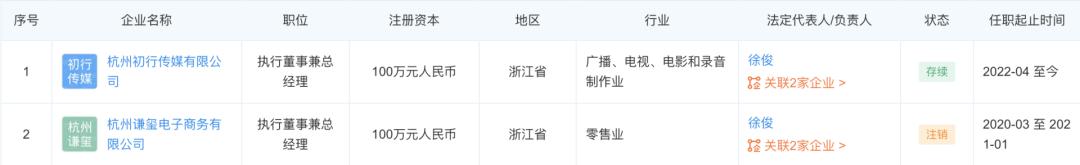 企查查顯示,杭州初行傳媒有限公司成立于2022年4月28日,法定代表人為徐俊。徐俊曾在2020年3月至2021年1月,擔任杭州謙璽電子商務有限公司執(zhí)行董事兼總經(jīng)理。杭州謙璽這一企業(yè)目前已注銷,但存續(xù)期間,由謙尋(杭州)文化傳媒有限公司持股70%,背后大股東正是薇婭老公董海鋒。