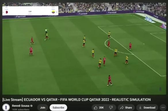 像是一個名為“RenneSousa”YouTube頻道在前不久直播開幕戰(zhàn)卡塔爾對決厄瓜多,吸引大量網(wǎng)友入內(nèi)觀看,同時觀看人數(shù)最高甚至達到3.6萬人,根據(jù)網(wǎng)站的數(shù)據(jù)顯示,前后累計觀看人數(shù)超過300萬次,這讓頻道的訂閱也漲到了20萬。