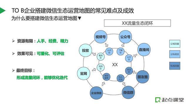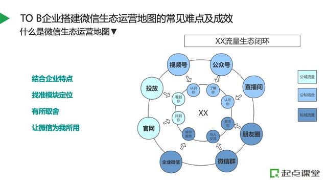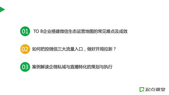 本次分享一共分為三大部分:第一部分是B端企業(yè)在搭建微信生態(tài)運營地圖時常見的難點及成效;第二部分是如何把控微信三大流量入口,做好開局拉新?第三部分是對企微私域與直播轉化的策劃和執(zhí)行的案例解讀。