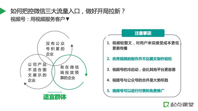 比如公眾號剛起來時,早期的用戶積累是通過投放,而早期的用戶成本較低,現(xiàn)在公眾號的用戶成本越來越高;但目前在視頻號還有投放場景,且在視頻號投放的企業(yè)并不多,所以企業(yè)可以在視頻號投放視頻或直播等,尋找外部公域流量的空間。