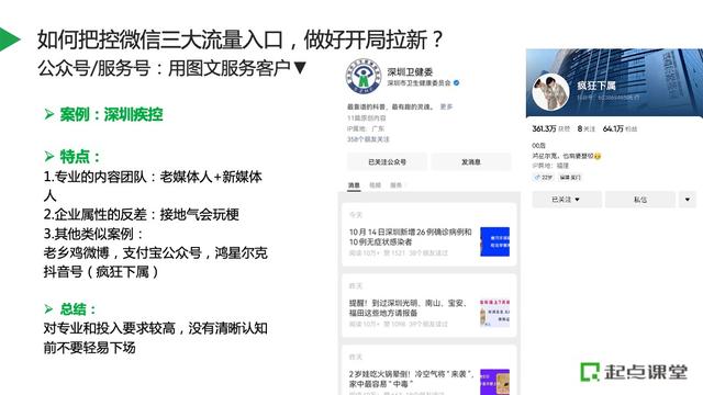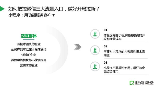 上圖右側微信生態(tài)運營地圖只是某企業(yè)現(xiàn)狀,不是每個企業(yè)都需要用到上述的模塊,需要結合企業(yè)自身現(xiàn)狀做取舍,讓微信為企業(yè)所用,而不是微信有什么就用什么,從而變得很被動。