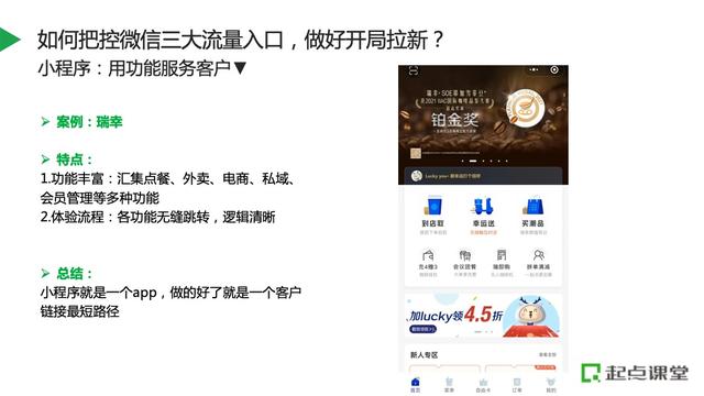 案例:瑞幸的自研小程序匯集了很多功能,主要有在線點餐、外賣、電商、私域和會員管理等,其功能切換、跳轉流暢、邏輯清晰,如果想靠外部成熟的小程序來搭建這些模塊是不現(xiàn)實的。