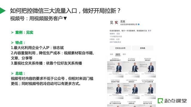 其內容主要有三大特點:一是最大化利用企業(yè)個人IP徐志斌,很多人即使不知道見實,也會知道徐志斌;二是內容重復利用,降低生產成本,如上圖右側所示,見實的視頻素材大部分來源于其自身的書籍、文章、分享等,不需要重新進行內容生產;三是重視社交關系傳播,主要依靠個微好友關系傳播,在早期時會引導添加徐志斌的個人微信等,即所謂的冷啟動措施,通過社交關系傳播鏈來進行內容傳播和推薦。