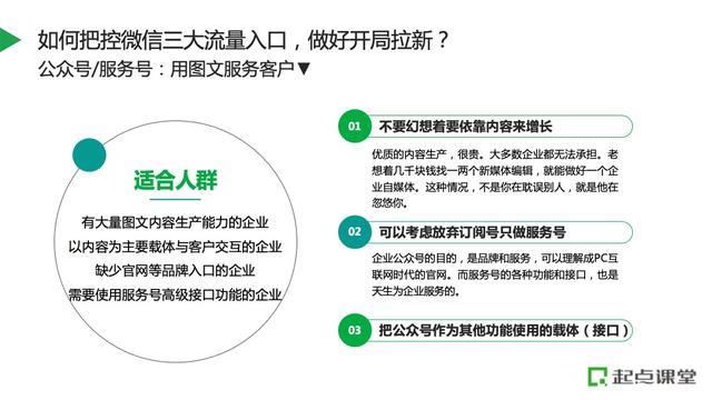 公眾號和服務號一是適合有大量內容沉淀且內容屬于圖文形式或能專門生產圖文的企業(yè)運營;二是企業(yè)產品更適合以圖文形式與客戶進行交互;三是企業(yè)沒有官網,缺乏外部的自然流量;最后是比較特殊的場景,即企業(yè)需要使用服務號特殊的高級接口功能,比如日常做裂變活動,需要對用戶的Unit ID進行識別等,需要通過公眾號的接口來實現(xiàn)。