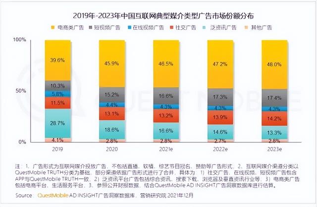 據(jù)QuestMobile數(shù)據(jù)顯示,從2019年-2023年,電商類廣告從39.6%到48.0%呈現(xiàn)增長的態(tài)勢,而短視頻廣告同樣如此,從原本的10.3%到17.4%。原本有著不少占比的泛資訊廣告不再受寵。