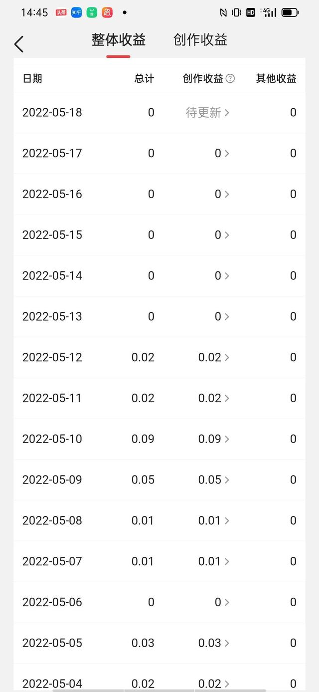 每天都發(fā)布一堆東西,都是幾分幾分的收益,要不就沒有。有時感覺刷刷頭條看文章看視頻,每天簽一下到、打開百寶箱收金幣、領(lǐng)取餐點金幣,收益都比寫文章,寫頭條還多。真的越寫越?jīng)]動力。