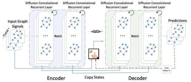 不論是普通的GRU還是DCRNN,都可以將整個圖上的所有節(jié)點序列同時輸入到模型中(相當于一個batch)。GRU在建模時,每個時間序列的表示使用共享的全連接層分別進行轉換,因此不同序列之間并沒有建立關系;而DCRNN中,模型根據(jù)臨接矩陣拉普拉斯矩陣的形式,可以生成一個不同節(jié)點表示的融合方式(矩陣),將每個序列的表示使用這個融合矩陣進行一次轉換,輸出的還是每個序列的表示,只不過通過融合矩陣建立的不同序列的關系,每個序列生成的表示都是其他序列的某種加權平均。其他部分和RNN類似,是序列建模的結構,模型整體結構如下圖: