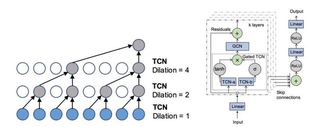 另一種模型框架是Graph WaveNet for Deep Spatial-Temporal Graph Modeling(IJCAI 2019)提出的TCN+GCN的結構。TCN是一種應用于時間序列預測的CNN模型,通過空洞卷積增大感受野面積,通過因果卷積防止數(shù)據(jù)泄漏。GCN就是圖卷積神經網絡。Graph Wavenet采用的是一層時序模型+一層圖模型嵌套的方式實現(xiàn)的。第一層輸入圖中所有節(jié)點的時間序列數(shù)據(jù),通過TCN每個序列獨立提取表示。在得到每個序列每個時刻的表示后,每個時刻內所有節(jié)點的表示使用GCN進行一次空間上的融合。假設輸入的維度是[N, T, D],N表示節(jié)點數(shù)量,T表示時間長度,D表示特征維度。經過一層TCN后,維度變成[N, T', D'],這一步是每個序列獨立進行的。接下來在T維度上,每一個時刻t都進行圖卷積,得到[N, T', D'']。