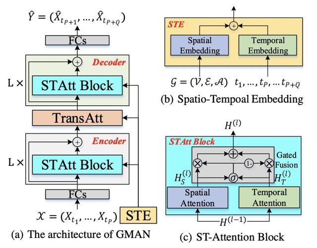 除了GCN外,基于Attention的圖時序預估模型也是一種主流方法。GMAN: A Graph Multi-Attention Network for Traffic Prediction(AAAI 2020,GMAN)提出了基于Attention的圖時序預估模型,在時間維度和空間維度都是通過Attention實現(xiàn)的。GMAN采用的模型框架與DCRNN、GraphWavenet都不同,GMAN在每層并行進行時間維度和空間維度的信息提取,再通過Gate進行融合。在時間維度,采用類似于Transformer的Attention模型,Encoder內部、Decoder內部、Encoder和Decoder之間進行Attention。在空間維度,利用Attention機制計算每一對節(jié)點之間的Attention score,這個attention score的作用類似于拉普拉斯矩陣,用于生成融合了其他節(jié)點信息的當前節(jié)點表示。模型整體結構如下圖所示。