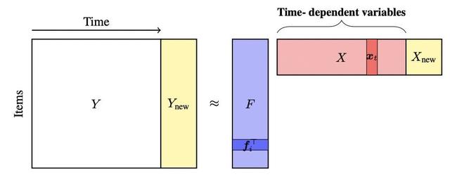 基于分解的多序列聯(lián)合建模方法,利用矩陣分解的思路,該方法最早起源于Temporal Regularized Matrix Factorization for High-dimensional Time Series Prediction(NIPS 2016,TRMF)。整體思路如下圖,將所有時間序列組成一個矩陣N*T,然后通過矩陣分解的方法,將原矩陣分解成兩個子矩陣F(N*d)和T(d*T),其中d*T可以理解為d個組成當前時間序列的base序列,數(shù)據(jù)中的所有序列都是由這些base序列的線性組合得到的。同時,為了讓矩陣分解得到的base序列符合時間序列的平滑特性,會對生成的每個base序列使用自回歸模型進行約束。