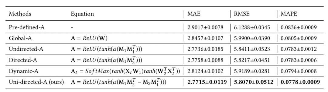 由于在時序預估中,有一些場景并不存在明確的節(jié)點之間的圖關系,因此有一些工作將圖結構的學習也融入到時序預估中端到端訓練。也就是說,這類方法的拉普拉斯矩陣,是網絡直接學出來的,而不是根據(jù)預先定義的臨接矩陣和度數(shù)矩陣計算得到的。在Graph Wavenet中就采用了這種方式。Connecting the Dots: Multivariate Time Series Forecasting with Graph Neural Networks(KDD 2020)中對這類方法不同的拉普拉斯矩陣學習方式進行了對比。下表列出了不同的拉普拉斯矩陣生成方法的效果對比,這類方法的一半思路是根據(jù)每個節(jié)點的Embedding,通過不同的計算方式得到拉普拉斯矩陣中每個元素的值,這個值直接用于后續(xù)的圖學習,端到端和時序預估任務一起訓練。