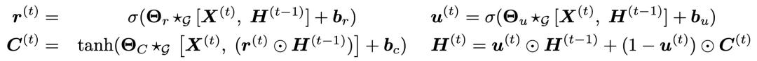 GRU是RNN模型的一種,DCRNN在GRU的基礎上,將原來GRU中的全連接部分修改為diffusion convolutional layer(隨機游走拉普拉斯矩陣+全連接),公式可以表示為如下形式: