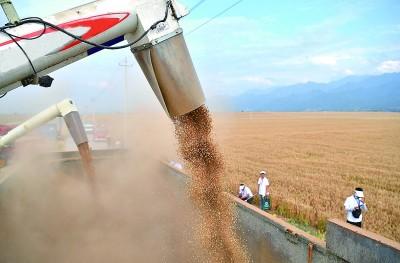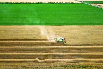 新疆昌吉回族自治州奇臺縣大泉塔塔爾民族鄉(xiāng)的麥田里,聯(lián)合收割機(jī)在收割小麥。新華社發(fā)