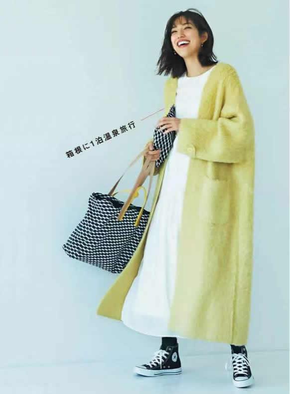 溫泉出行時,黃色大衣與小白裙的恣意飛舞,放任的寬松廓形里,幸好有優(yōu)雅帆布鞋的足下調(diào)和,扳回一點大氣分值。