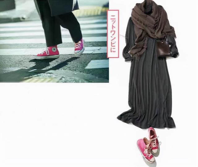 關鍵一點:與黑棕等深色搭配,粉色帆布鞋完勝無壓力!即使沒有明顯的兩兩呼應,但同屬一家的本性擋也擋不住,遠比藍色更討喜。