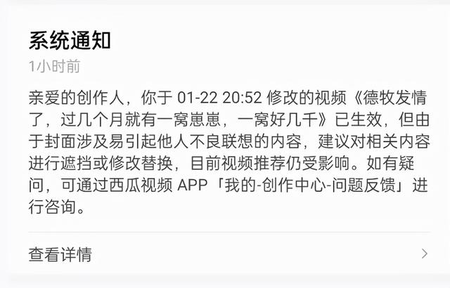 這是我今天意外的收獲,我在2022年1月21日發(fā)的一個視頻,一天的播放量才3000多,本以為這個視頻也就差不多這樣了,意外的是22號晚上系統(tǒng)提示我這視頻封面引起他人不良聯(lián)想的內容,給限制推薦了,沒辦法,只能重新更換封面,我順便選標題也一起更換了。