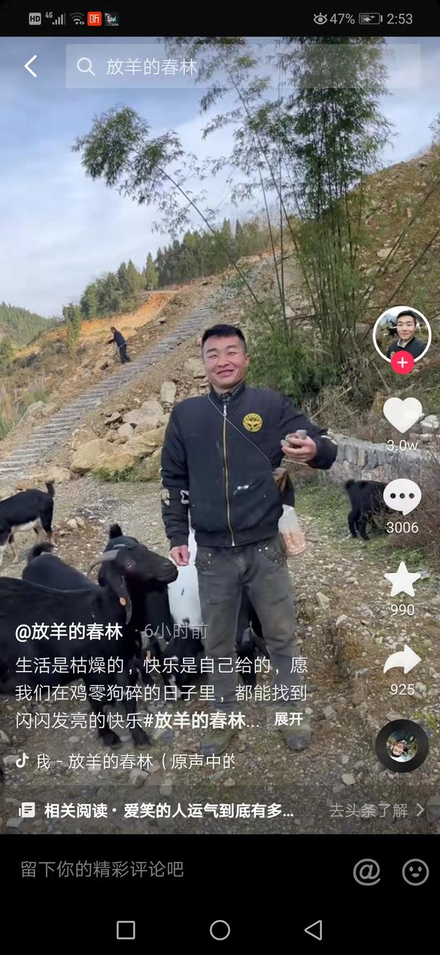 這位中國農(nóng)村小伙之前在城市工廠打工,每天工作12個小時,疲憊不堪,女友離他而去。后來毅然的決定回農(nóng)村放羊,回歸山林。通過他每天發(fā)布的抖音視頻可以看到,春林小伙每天在青山綠水間與自己的龐大羊群為伴,好不自在。他那淳樸的笑容,以及固定的抬腿動作,從懷里掏出送給網(wǎng)友的小禮物。粉絲量從最初的十幾個,發(fā)展到現(xiàn)在的50.5萬。俘獲了抖音上眾多美女網(wǎng)紅及粉絲的心,紛紛表示愛意并嫁給他。并且依靠抖音也帶來了可觀的收入。