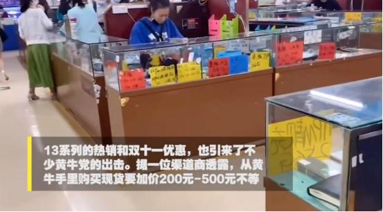 iPhone 13的熱銷也吸引了大批黃牛黨的主動出擊,據(jù)了解,從黃牛黨手里購買現(xiàn)貨要加價200到500塊錢左右不等。