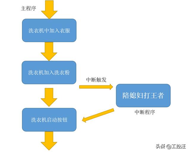 什么是中斷:中斷就是當(dāng)PLC正在執(zhí)行某一個動作時,突然收到中斷觸發(fā)信號,立即停止當(dāng)前執(zhí)行動作,去執(zhí)行中斷程序中的動作,中斷程序執(zhí)行完成后返回被打斷的地方繼續(xù)執(zhí)行之前動作,中斷程序的優(yōu)先級最高,不受掃描周期的影響;就比如你正在洗衣服,正洗了一半,突然你媳婦喊你打王者榮耀,于是你立即停止洗衣,開始打游戲,打完王者后,你又返回繼續(xù)洗衣服。你媳婦喊你打王者是觸發(fā)中斷,你打游戲是中斷運行程序,你洗衣服時主程序;