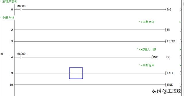 應(yīng)用案例:X0作為外部輸入脈沖計數(shù),X0的下降沿時觸發(fā)中斷進行計數(shù);在三菱PLC的梯形圖編程中程序如下圖所示;