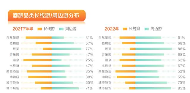 其次針對酒旅行業(yè),該報告強調目前長線游遇冷,周邊游升溫,戶外游覽項目受歡迎。相比2021年下半年,2022年初自然景觀周邊游交易額占比由31%上升至61%,植物園、展覽等周邊游交易額占比則分別從57%、77%上升至68%、86%,增勢明顯。