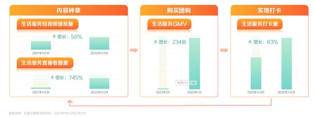基于此,平臺內形成了先進行內容“種草”,繼而轉向“購買團購”,最終“實地打卡”的綜合體驗流程。這個流程以更短、更高效的消費鏈路推動用戶交易。據(jù)統(tǒng)計,從2021年1月到2022年1月,生活服務GMV增長234倍,生活服務打卡量在同期也增長了63倍。