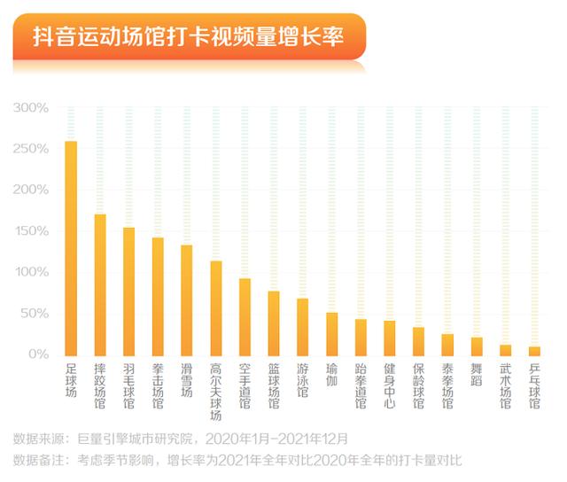 最后在到綜行業(yè),該《報告》顯示健康運動、麗人休閑的需求擴大,更為多元。足球場、摔跤場館、羽毛球館的熱度顯著增加,相比2020年,2021年在足球場打卡量增速更是高達250%。尤其是2022年帶動了滑雪運動在國內的熱度,滑雪場的打卡量增長率達140%。