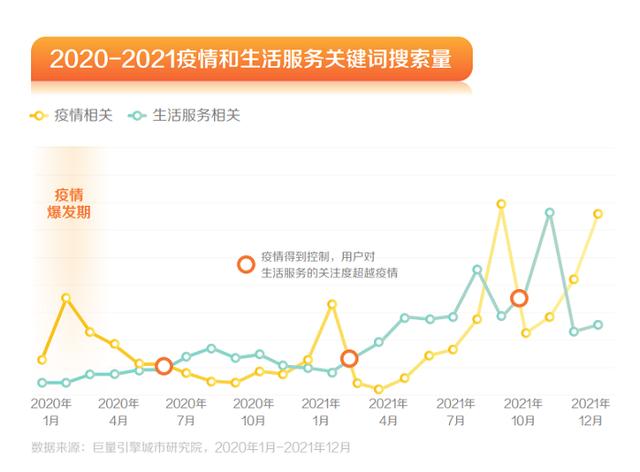 《報告》中特以西安為例來論證。在2021年11月到2022年2月西安疫情爆發(fā)時,疫情和生活服務相關的搜索量在疫情前后呈現(xiàn)“此消彼長”的趨勢。當2月份當?shù)匾咔榈玫接行Х揽貢r,用戶對于生活服務相關的搜索量達到56%的增長。