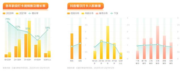 這部分群體在消費之后將線下美食經歷發(fā)布于抖音上,從“拔草人”轉化為新的“種草人”。其中31-40歲人群是傳播主力,但數(shù)據(jù)顯示50歲以上人群也開始涌進餐飲體驗的打卡潮流之中,視頻數(shù)據(jù)在近一年開始翻倍,TGI(目標群體在特定研究范圍內的強勢或弱勢)指數(shù)猛增。