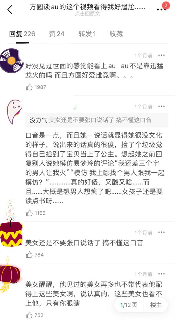 因為不少網友認為方圓這番話,就是將AU抬到了更高的地位,直指兩人關系之間的不平等。還有不少網友直接點出讓方圓多讀點書,不要只看到了自己配不配得上AU。說到AU和方圓。AU是近半年來興起的音樂類博主,AU一開始就是通過翻唱各類rapper的歌曲走紅,隨后通過和其他網紅的直播連麥持續(xù)走紅。