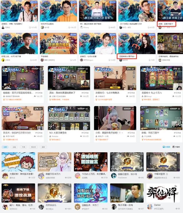 從虎牙斗魚B站等直播平臺爐石傳說板塊的情況來看,近期晚上黃金檔在期間靠前的主播中,虎牙2位主播在標題中表示轉戰(zhàn)亞服,斗魚2位主播在播《鵝鴨殺》,1位在播《弈仙牌》,1位在播《原神》七圣召喚,2位主播將美服掛在了直播標題中,B站則是有1位主播播其他游戲,1位播《鵝鴨殺》,1位標題中提到在播亞服,1位主播則是在玩《弈仙牌》。