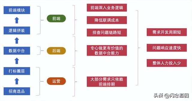 如上圖所示,在FaaS化之前,傳統(tǒng)的前后端分離的生產(chǎn)關(guān)系存在天然的缺陷。由于數(shù)據(jù)拼裝本身和UI邏輯是強(qiáng)耦合的,分成兩個(gè)人去做,會(huì)導(dǎo)致存在天然的邊界不清、聯(lián)調(diào)成本高等問題,導(dǎo)致整個(gè)需求的開發(fā)周期變長。我們希望把邏輯拼裝交給前端來做,而后端下沉到數(shù)據(jù)中臺(tái),專心做對(duì)他們來講價(jià)值更好的中臺(tái)服務(wù)。這樣可以實(shí)現(xiàn)三方共贏。改變之后的生產(chǎn)關(guān)系如下圖所示: