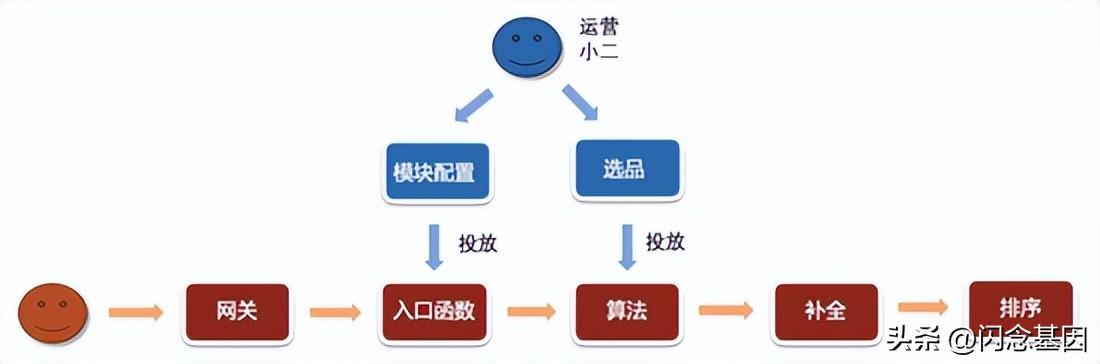 上圖展示了輕應(yīng)用的典型數(shù)據(jù)邏輯。這些輕應(yīng)用的主要邏輯都在BFF層,大量的需求都是進(jìn)行接口和數(shù)據(jù)的拼裝,比較適合FaaS接入。以運(yùn)動(dòng)頻道的Feeds模塊為例,其流程如上圖所示。其中藍(lán)色部分是運(yùn)營小二的離線配置,紅色部分為在線鏈路,這個(gè)流程對(duì)大部分的頻道模塊都是適用的。