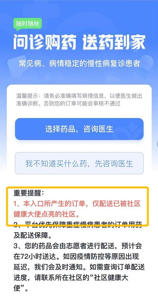 2、如果要自費(fèi)購(gòu)藥,則點(diǎn)擊“上海醫(yī)保便民門診”左下方的“在線購(gòu)藥”模塊,首先確認(rèn)所在地是否被“社區(qū)健康大使”進(jìn)行“點(diǎn)亮”,“點(diǎn)亮”即說明:您所在地區(qū)可以配送,一般在72小時(shí)左右可以送達(dá)。如本小區(qū)無(wú)“社區(qū)健康大使”,則無(wú)法配送上門。