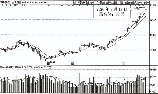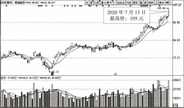如圖所示,恒瑞醫(yī)藥的股價在2020年上半年隨著股市的大幅上攻 同步上漲并不斷創(chuàng)下新高。2020年7月13日,恒瑞醫(yī)藥創(chuàng)下了 105元的階 段高點。通過我們對恒瑞醫(yī)藥內(nèi)在價值的分析可知,在分紅配股后,恒瑞醫(yī) 藥的每股內(nèi)在價值不應該超過31.78元,而此時股價卻已經(jīng)上升至105元的 高位,說明股價存在一定的高估。