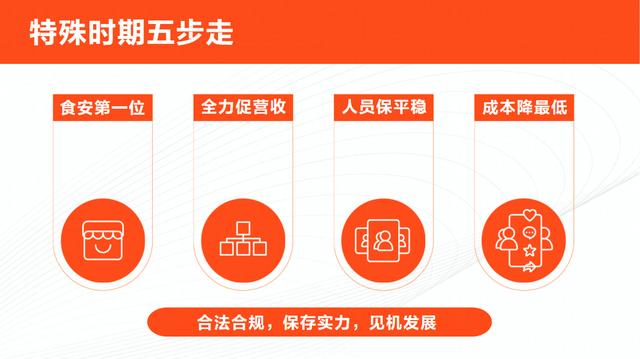 餐飲商家在特殊時期首先要記住這五步:食安第一位、全力促營收、人員保平安、成本降最低,最后是合法合規(guī),保存實力,見機發(fā)展。
