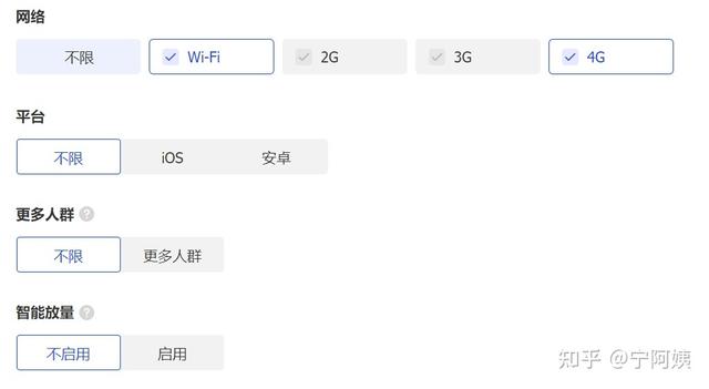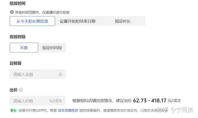 投放時間和時段,自由選擇,一般情況跟上圖一樣選第一個。預算建議從300開始,不要一開始就拉滿,原因有兩個: