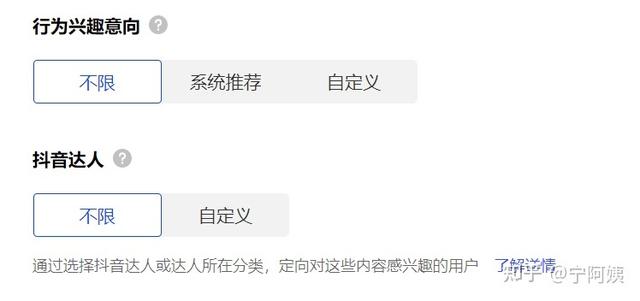 行為興趣和抖音達人這里選擇有一個原則,先窄后寬,先窄定向跑出訂單再慢慢加些周邊類目和相關(guān)詞語,一條計劃里可以只選行為興趣或者抖音達人,也可以都選,沒有那個效果一定就好,具體以跑出來的數(shù)據(jù)為準。