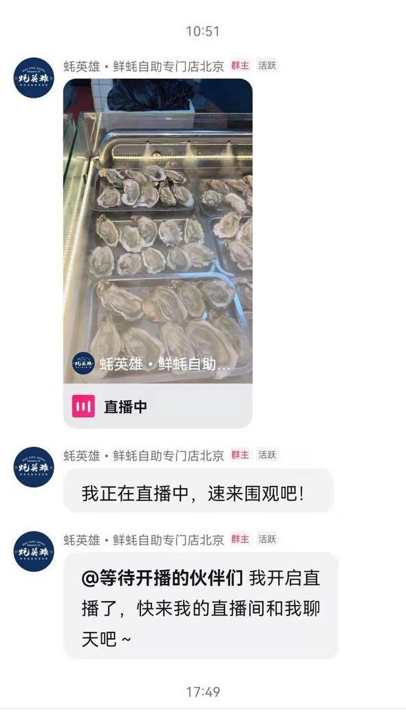 另外,在截圖中我們看到這家生蠔除了做常規(guī)的短視頻和直播之外,在抖音平臺還可以沉淀自己的私域流量。線上社群有很多自動化的操作,比如商家發(fā)了短視頻、開了直播,它會自動通知到群里的粉絲。消費者一旦喜歡上這個商家了,他們甚至會在群里面去問“今天有沒有直播啊”、“你直播里面有沒有什么好的餐品推薦”等等。這是因為我們長期在直播、短視頻中展示了餐品的優(yōu)勢,形成了自身的品牌,所以才有了之后社群的活躍。
