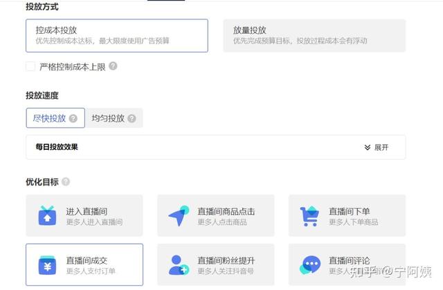 投放方式:控制成本投放、投放速度盡快投放、優(yōu)化目標直播間成交,初期這3個釘死不用用動,等有足夠經(jīng)驗了可以嘗試放量投放。