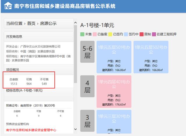 大V君查詢南寧市住建局銷售公示系統(tǒng)發(fā)現(xiàn),從2019年1月獲得首張預(yù)售證以來,3年多的時(shí)間,中國錦園共有1513套商品房拿證,但僅賣出549套,銷售三分之一左右。