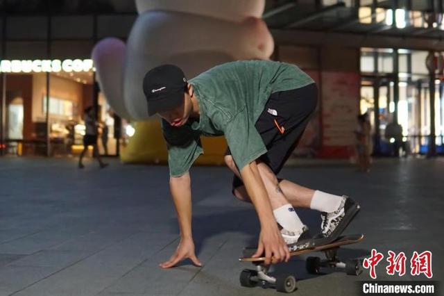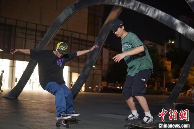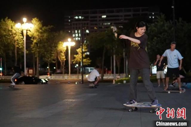 7月23日21點半,廣西柳州一處廣場上,跳廣場舞的老人們散去后,這里便成為“滑板青年”們的主場。他們?nèi)宄扇海p臂微張,以半蹲姿勢腳踩滑板,在廣場上來回穿梭。