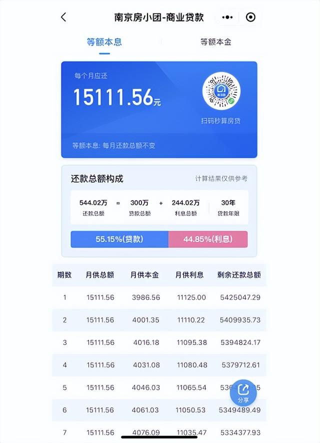 6月,南京主流房貸利率4.45%,以此計(jì)算,每月還款金額15111元,還款總額544萬,利息約244萬。