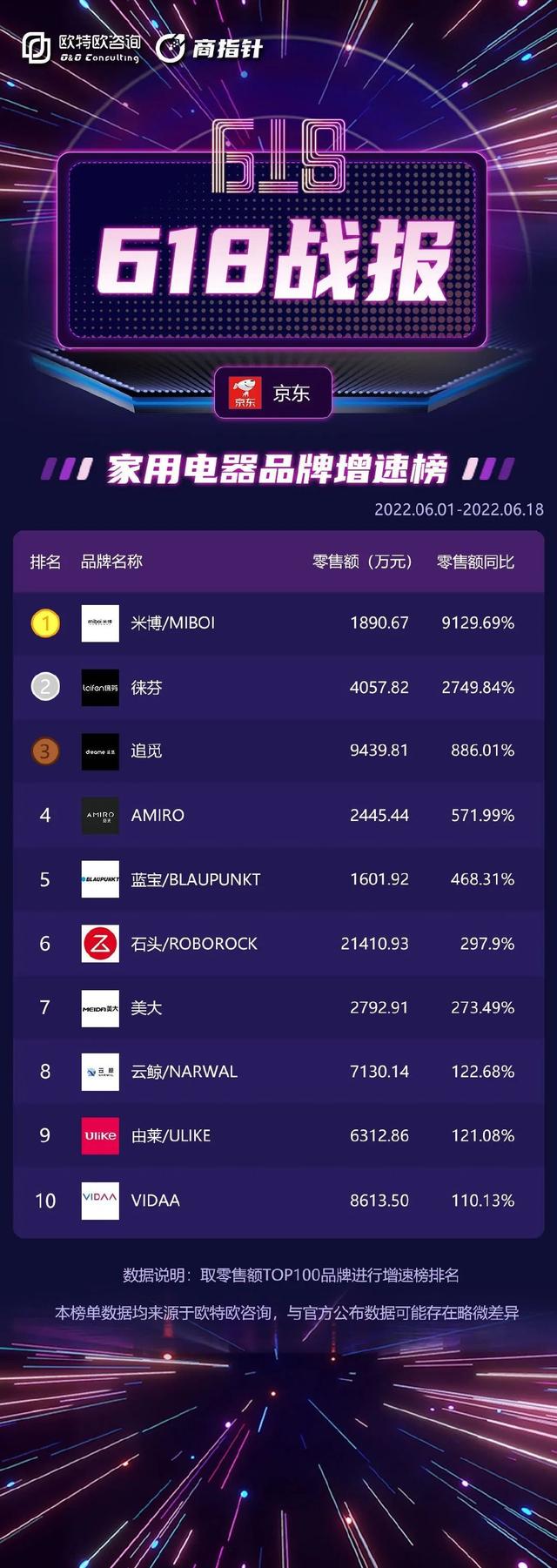 從家用電器的銷售榜單來看,除“西門子”以外,其余9個品牌均為國產(chǎn)品牌,國產(chǎn)電器已經(jīng)成為了京東渠道網(wǎng)絡零售的“核心勢力”。家用電器高增品牌除了主營電視的海信子品牌“VIDAA”,其他品牌則分別來自小家電各細分行業(yè)的龍頭品牌。其中“米博”深耕廚房小電和清潔小電;徠芬則號稱“小戴森”;追覓、石頭和云鯨則是掃地機器人“三巨頭”。